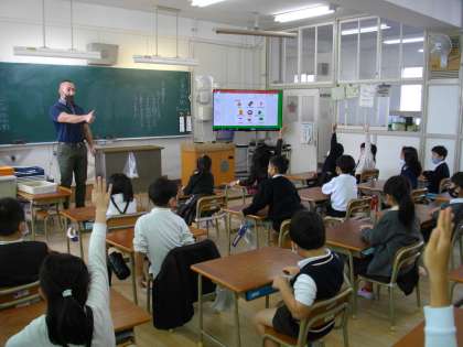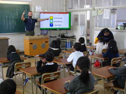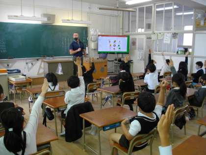 英国(The U.K.)出身のロバート・ノーマイル(Mr.Robert Normile)先生が、本校で英語を教えるのは3度目です。今回は1・2・4年生向けに英語の授業を行いました。
