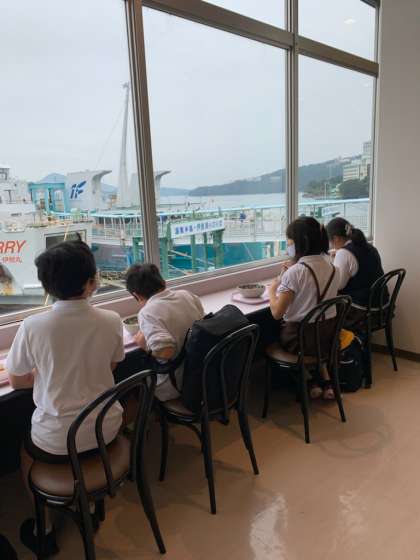 早速、海や船をみながらお昼ごはんを食べている児童もいます。