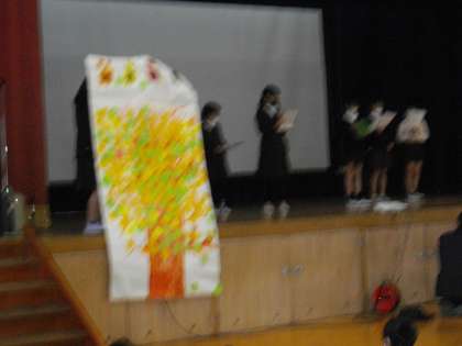 まず、10月は「読書月間」でしたので、図書室前の「本の木」がどれだけ成長したのかについて発表がありました。