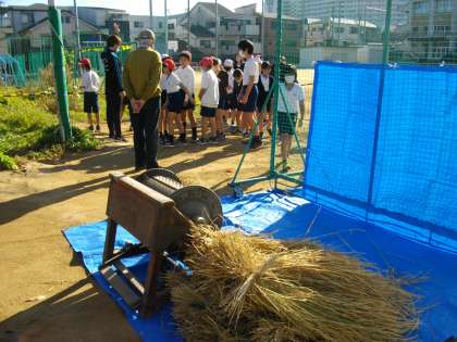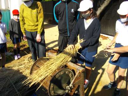 5年生は、毎年、ボランティアの林さんのご指導で6月の田植え、11月の稲刈り、今回の脱穀を体験します。都会ではなかなか経験できないので、子どもたちは興味津々、夢中になって脱穀をしました。また、最新の機械を使用するのではなく、昔の機械を使って、足で踏みながらの作業なので、最初は随分苦労していましたが、すぐに慣れて器用に機械を動かしていました。