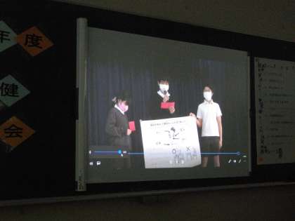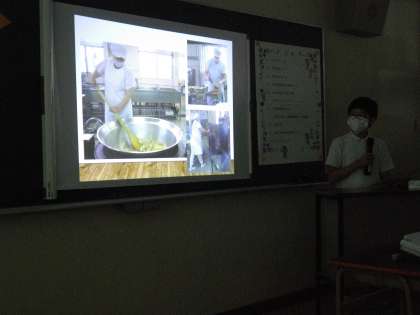 給食室で、給食調理員さんが一生懸命おいしい給食を作っている様子を紹介したり、2年生のクラスでお話したことを発表したり、全校児童の集まる児童集会で発表したことなどを、ビデオや写真を使って発表しました。