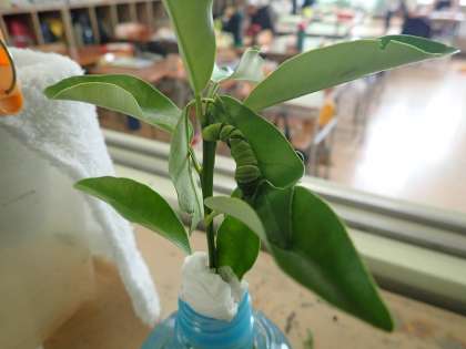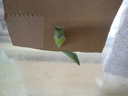 さらに脱皮をし、緑色の幼虫(約3〜3.5cm)となり、動かなくなると、とうとう蛹(さなぎ)なりました。