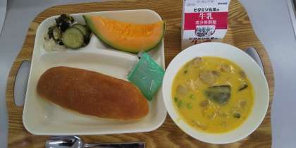 今日の献立は、コッペパン、牛乳、かぼちゃのクリームシチュー、ミックス海そうのサラダ、クインシーメロンです。