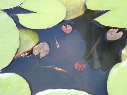 そのスイレンの葉の間に、数匹のメダカが泳いでいるのが見え隠れしています。