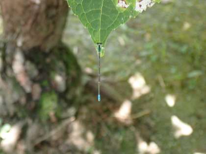 ふと横を見ると、葉っぱの先に、糸トンボが止まっていました。つまようじぐらいの大きさの小さな小さなトンボです。カメラを近づけても飛び立とうとしませんでした。