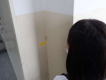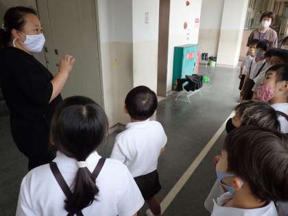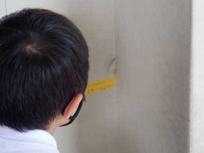 先ほど紹介したモンシロチョウが羽化した後、1階ローカの壁にしばらく止まっている様子を、3年生・1年生の子どもたちがとても興味深そうに観察していました。