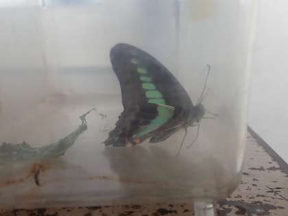 ただし、このアオスジアゲハは、虫かごの中のさなぎがチョウになったものではなく、今朝、教頭先生が捕まえたチョウです。