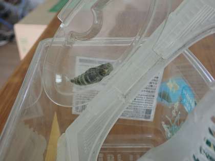 R3.6.24(08:25)、1・2年生が、今まで約1か月間、教室で育てていたアオスジアゲハがチョウになろうとしています。