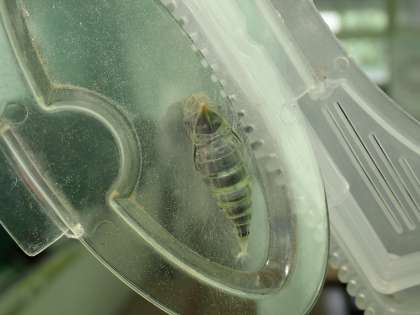 これまでうすい緑色だったさなぎが、本日早朝には、さなぎの中がすけて見え、うっすらと黒色の羽(はね)に、青色のすじが見えるようになりました。
