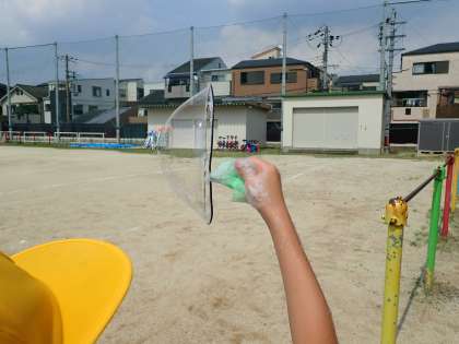 今日のなかよしタイムはシャボン玉遊びをしました。大きなシャボン玉を作るために、ふく息の量をうまく調節したり、もっとやりたいという気持ちをがまんして次の人に順番をゆずったりといろいろな学習をしました。青い空にふわふわとんでいくシャボン玉を追いかける子もいれば、いっぱいのシャボン玉を作って楽しむ子、大き〜いシャボン玉を作ろうと何度も挑戦する子。たくさんの笑顔のシャボン玉がはじけました。