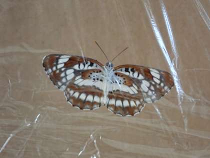 奈良の自宅にある「ユキヤナギ」の葉にホシミスジチョウの幼虫が2匹ついていて、さなぎになるのを待ってから学校に持ってきました。そのさなぎから羽化したばかりのホシミスジチョウです。