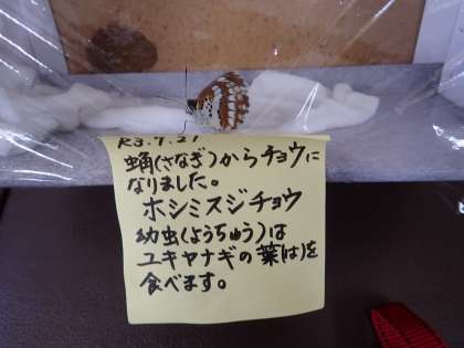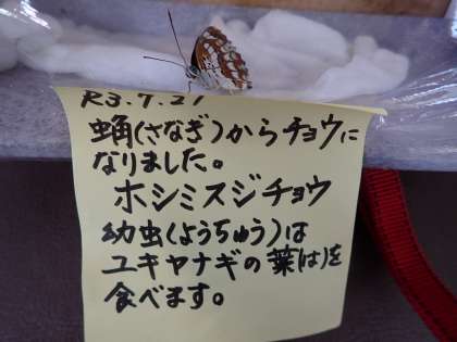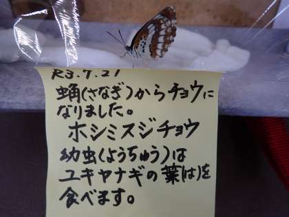 R3.7.21朝、2匹目のホシミスジチョウが羽化(うか)しました。ちなみに、チョウは2頭(2とう)と数えます。