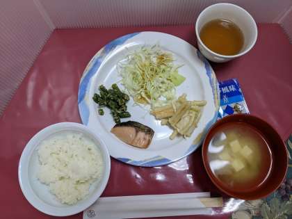 朝ごはんは鮭定食です。