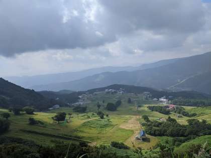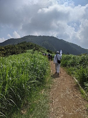 頂上へ向けて歩いてます。鳥の声、蝉の鳴き声、近くでブ〜ンという音。いろんな音が耳に入ってきます。時折り、爽やかな風も吹きます。