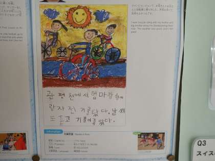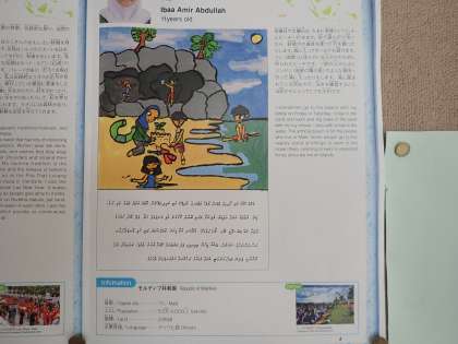 彼らは、自分が書いた絵日記を、自分の国の言葉と英語で表現しています。