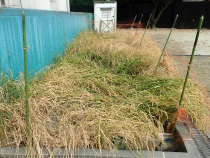 今年も、たくさんの稲穂(いなほ)ができており、稲穂が重すぎて地面につきそうです。明日、天気がよければ稲刈りをします。その後、しばらく天日干し(てんぴぼし)してから、脱穀をします。