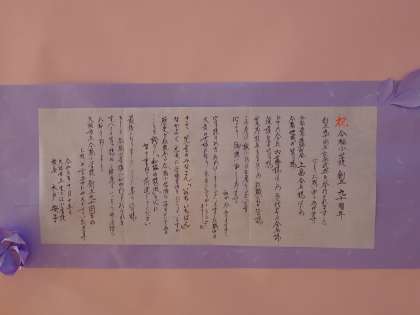 3枚目の写真は、前校長の木戸安子様から手書きの立派なご祝辞をいただきましたので、ご紹介いたします。