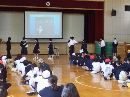 始めに、体育館に放出小学校と今福小学校の6年生が一同に集まり、中学校の校長先生や生徒会から、歓迎のごあいさつがありました。