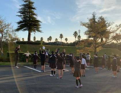 全員元気に目覚めて,外で朝会始めます。