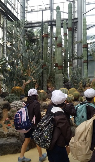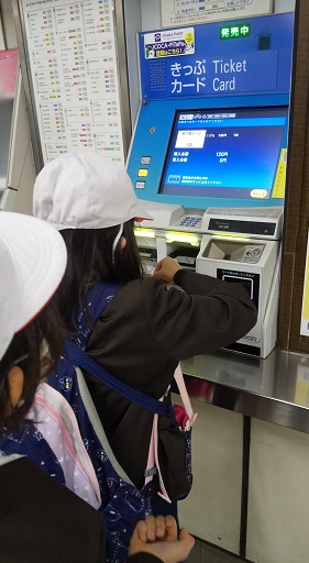 11月10日、鶴見緑地公園へ秋見つけに出かけました。2年生は駅の券売機で一人ずつ切符を買う学習をします。初めて、切符を買う子どもたちも多く、前の人の押すボタンをしっかり見つめています。落とさないよう握りしめていたお金を入れて緊張しながら切符を買いました。鶴見緑地公園では、いろいろな形・大きさのどんぐりや赤や黄色に色づいた葉っぱ、赤や紫の木の実などたくさんの秋を見つけ、宝物のように夢中になって拾い集めました。咲くやこの花館では、バナナの実がなっているところやラフレシア、サボテン、食虫植物など珍しい植物に目をキラキラさせながら見て回りました。
