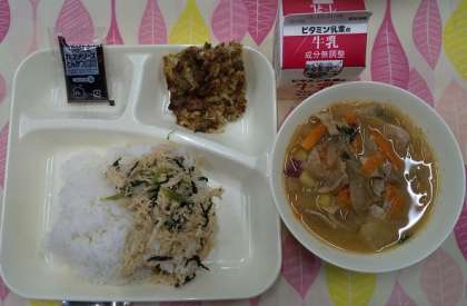 今日の献立はとりなっ葉いため、豚汁、お好み焼き、ごはん、牛乳です。新登場の「とりなっ葉いため」は鶏のささみとだいこんの葉を使った、ごはんによく合う献立です。だいこんの葉は、カロテンやビタミンCのほか、カルシウムや鉄などを多く含む緑黄色野菜です。ささみは、胸の近くにある肉です。笹の葉に形が似ているので、ささみと言われます。お好み焼きはソースをつけるとVeryGoodです。