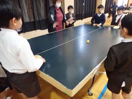 また、目が不自由が卓球が楽しめるように工夫された卓球台で、本校の児童も卓球の体験をしました。