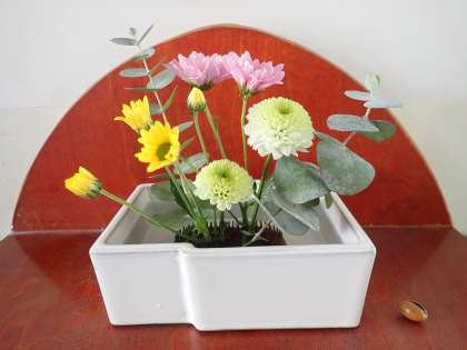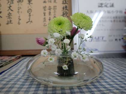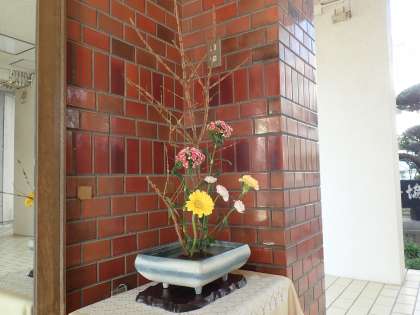 ボランティアで、喜島さんが玄関、廊下、校長室に可愛いお花を活けてくださいました。