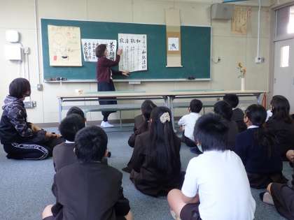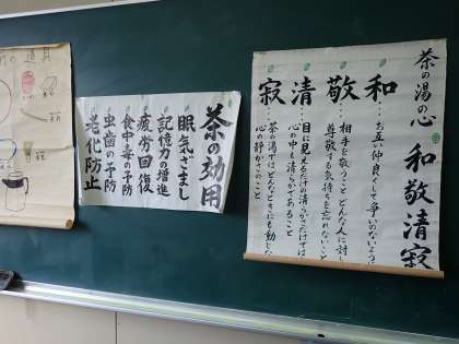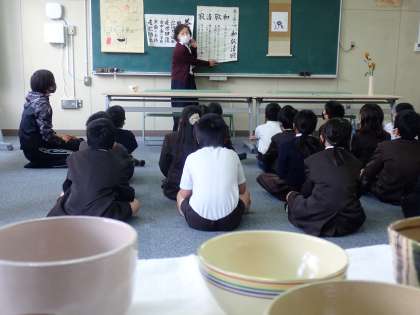 本日11月25日(木)、喜島さんはじめ5人のボランティアの方に、5年生児童を対象に茶道教室を開いていただきました。