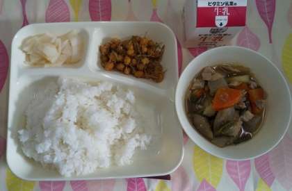 今日の献立は、鶏肉と野菜の煮物、じゃこ豆、かぶのゆず風味、ごはん、牛乳です。