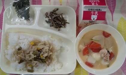 正月には新しい年のはじまりを祝い、「今年も幸せに過ごせますように」と願って食べる料理がたくさんあります。今日の給食には「ぞう煮」と「ごまめ」が出ます。ぞう煮はもちと、いろいろな具材を入れた汁ものです。地方や家庭ごとに入れる具や味付けなどに特色があります。今日のぞう煮に使われている金時にんじんはなにわの伝統野菜のひとつです。ごまめは「田作り」とも言われます。昔、肥料としてイワシを田にまいたところ、豊作になったことから、豊作を願う気持ちがこめられています