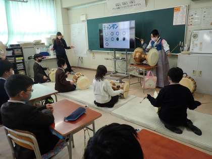 韓国の民族楽器のご紹介や児童が楽器演奏をするなど、子どもたちは、貴重な体験をしました。