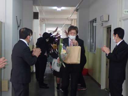 卒業生が、一人ずつ退場する姿に、保護者の皆さまから温かい拍手で送っていただきました。最後は、担任の先生を先頭に、卒業生が元気に巣立っていきました。