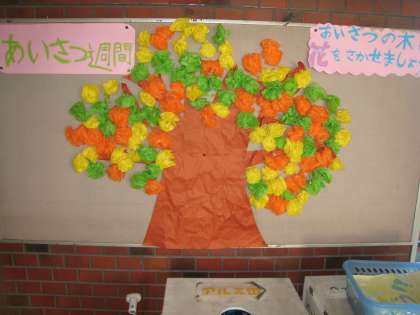 本校では毎月あいさつ週間を設けています。もっと、今福小学校の子どもたちがあいさつを意識してできるようにと、「あいさつカード」と「あいさつの木」を代表委員の子どもたちが考えました。低学年・中学年・高学年ごとに「あいさつの木」に咲かせる花の色を変えて「あいさつカード」のシールの枚数に応じて「あいさつの木」に花をつけました。これからもたくさんの花が咲くといいなあと思います。