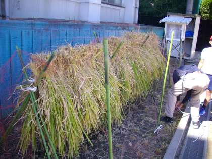 本校では毎年、シニア自然大学校「風と緑の会」の方からのご指導を受け、5年生が体験学習として稲作に取り組んでいます。運動場の一角に専用の「田んぼ」があり、本日は6月の「田植え」に続き、「稲刈り」を行いました。児童たちにとっては初めての刈り取り作業でしたが、鎌を安全に取り扱うことができていました。次は「脱穀」の体験学習を行います。