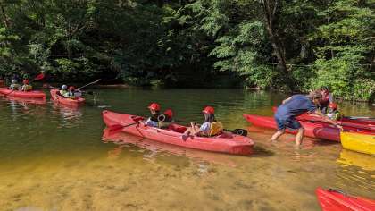 先ほど教えてもらったことを思い出しながら、カヌーへ乗り込みます。