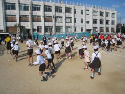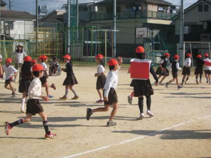 今日の児童集会は全校児童が赤白に分かれての「追っかけ玉入れ」です。集会委員の児童が籠を背負って逃げ回ります。低学年・中学年・高学年と3つの対決をしました。楽しい集会になりました。