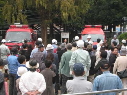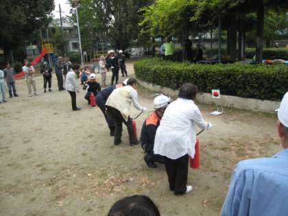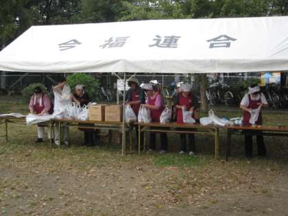 10月11日(日)に今福地域の地域防災訓練がありました。南今福公園に各町会から合わせて300人を超える参加がありました。区役所の方や消防署の方も参加され、救急救命の方法や消火訓練、被災した場合の道具の使い方などの体験がありました。参加された方は、女性会のみなさんの炊き出しをいただきました。