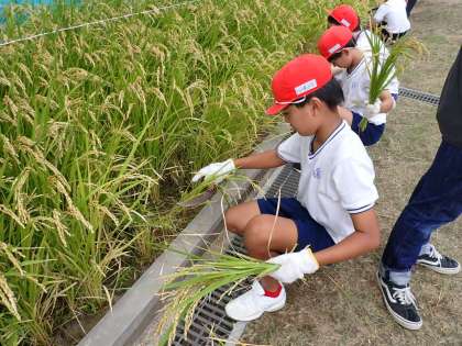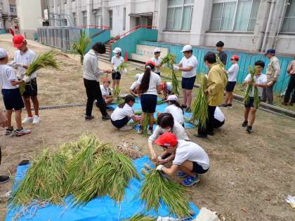 本日、5年生が「稲刈り」と「はさ掛け」の体験学習を行いました。風と緑の会のスタッフの方々に指導いただき、ノコギリ鎌を使って1株ずつ刈り取っていきました。刈り取られた株を縄で束ね、ハサに掛けてしばらく乾燥させます。来月は「脱穀」の体験学習を予定しています。