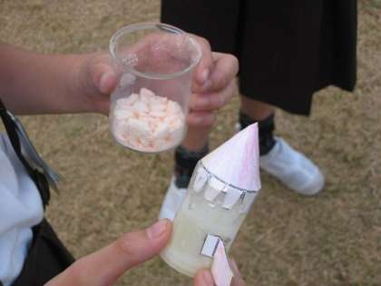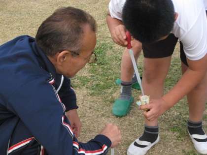 4年生から6年生の児童は、クラブ活動の時間があります。科学クラブでは、フィルムケースロケットの実験をしました。フィルムケースのふたが発射口になるように画用紙の型紙を切り取って貼ります。フィルムケースには発泡性入浴剤を砕いていれてから水を入れふたをします。しばらくすると「ポン」と音を立てロケット発射となるのです。安全に気を付けながら楽しく活動できました。