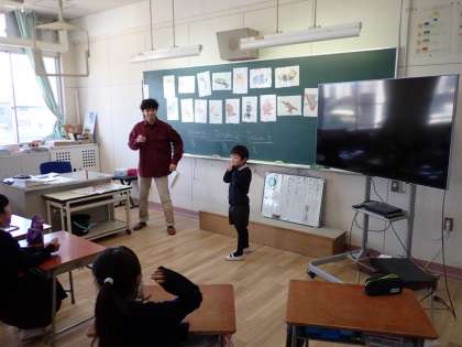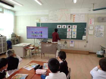 小中学校9年間の英語教育を見据え、本校では3〜6年生に加え、1〜2年生に対しても外国語講師を招いて英語活動を行っています。歌やゲームなど、英語への興味や関心を高める工夫を凝らしています。