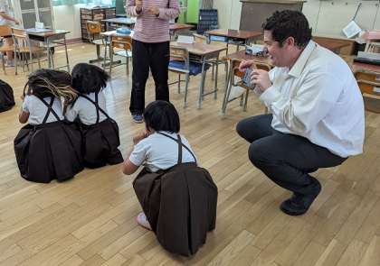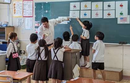 今日は、外国語の講師の先生に来ていただいて、1・2年生に教えていただきました。色や動物の名前を言ったり、動物の鳴き声を日本語や英語で言ったりして遊びました。教室中、体を動かしながら目を輝かせて楽しい時間を過ごしました。