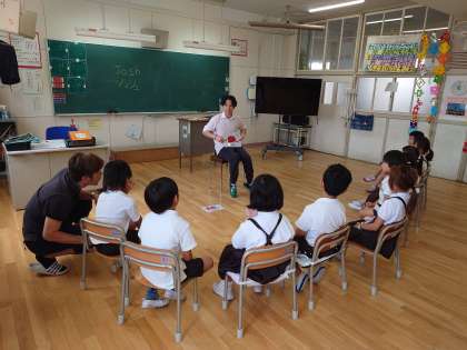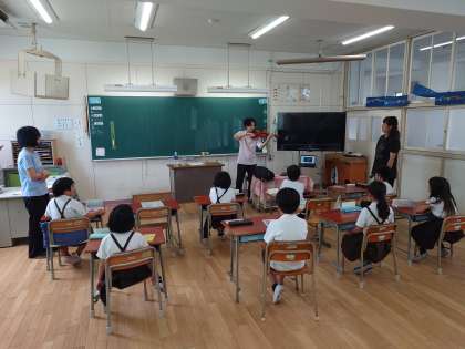 先月に引き続き、外国語の講師の先生に来ていただいて、1・2年生に教えていただきました。先月とはまた異なる講師の先生でしたが、前回に習った色や動物の名前や季節について学びました。また有名な曲をヴァイオリンで演奏していただき、児童は楽しい時間を過ごすことができました。
