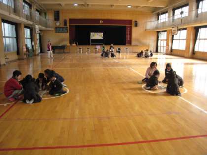 地域の皆さんをお招きして1年生が昔遊びの体験をしました。はじめは「はないちもんめ」や「とうりゃんせ」「かるた」などを地域の皆さんと一緒に遊びました。