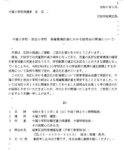 今福小学校・放出小学校 再編整備計画にかかる説明会の開催について