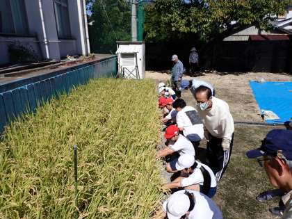 10月10日(木)シニア自然大学校 風と緑の会の皆さんに来ていただき、稲刈りを行いました。5年生にとって、初体験となるため、のこぎり鎌の安全な使い方を教えていただき、一人一人稲刈りをしました。刈り取った稲は、まとめて縄で結ぶ作業も行いました。