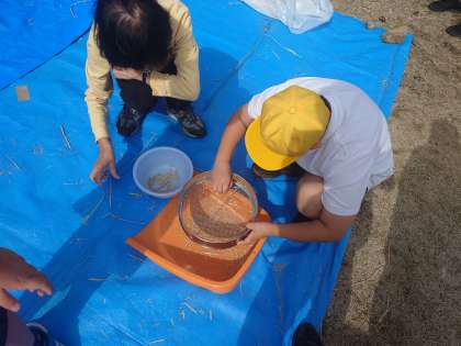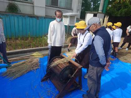 5年生が田植え、稲刈りに引き続き、シニア自然大学校 風と緑の会の皆さんのご指導のもと、今回の脱穀を体験しました。都会ではなかなか経験できないので、児童は夢中になって脱穀をしました。また、最新の機械を使用するのではなく、昔の機械を使って、足で踏みながらの作業なので、最初は随分苦労していましたが、すぐに慣れて器用に機械を動かしていました。
