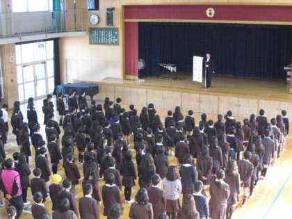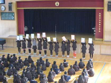 今朝は大変冷え込みが厳しかったですが、児童は元気に登校できました。今日の児童朝会では校長先生から3つのことわざについてお話がありました。その後、健康委員会の児童から、今日から始まる「給食週間」について「給食かるた」やクイズで紹介がありました。