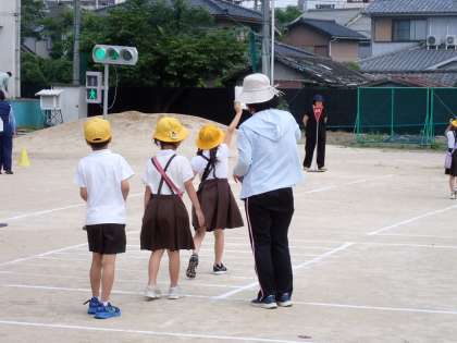 6月4日(水)城東警察署と区役所から来ていただき、交通安全教室を実施しました。1〜3年生は歩行訓練ということで、運動場に交差点を準備して安全に横断することについて学習しました。