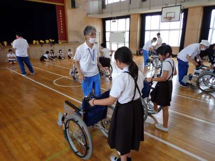まずは、体育館で車いすの操作について学んだ後、お友だちをのせて校舎内コースを巡りました。実際に体験することで、車いすを利用する方々の気持ちや、介助する方々の気持ちに立って考え、寄り添えるようになってもらいたいと考えます。