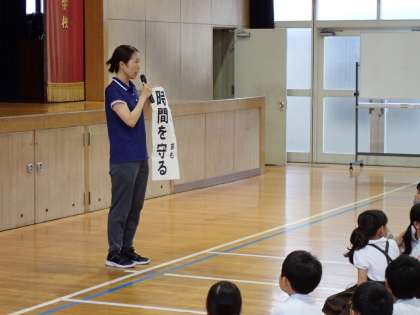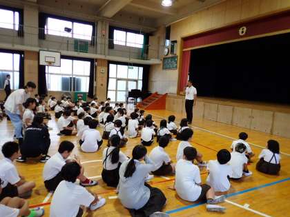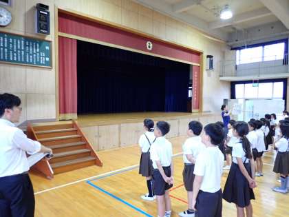 学校長から、1学期間毎日暑い日も雨の日も登校してきたことはすごいことで、自分をほめてくださいという話と、夏休みは自分で自分の生活を考えて行動することに挑戦してほしいとの話がありました。生活指導の先生からは、「時間を守る」ことに挑戦してほしいとの話がありました。最後に全員で元気よく校歌を歌いました。